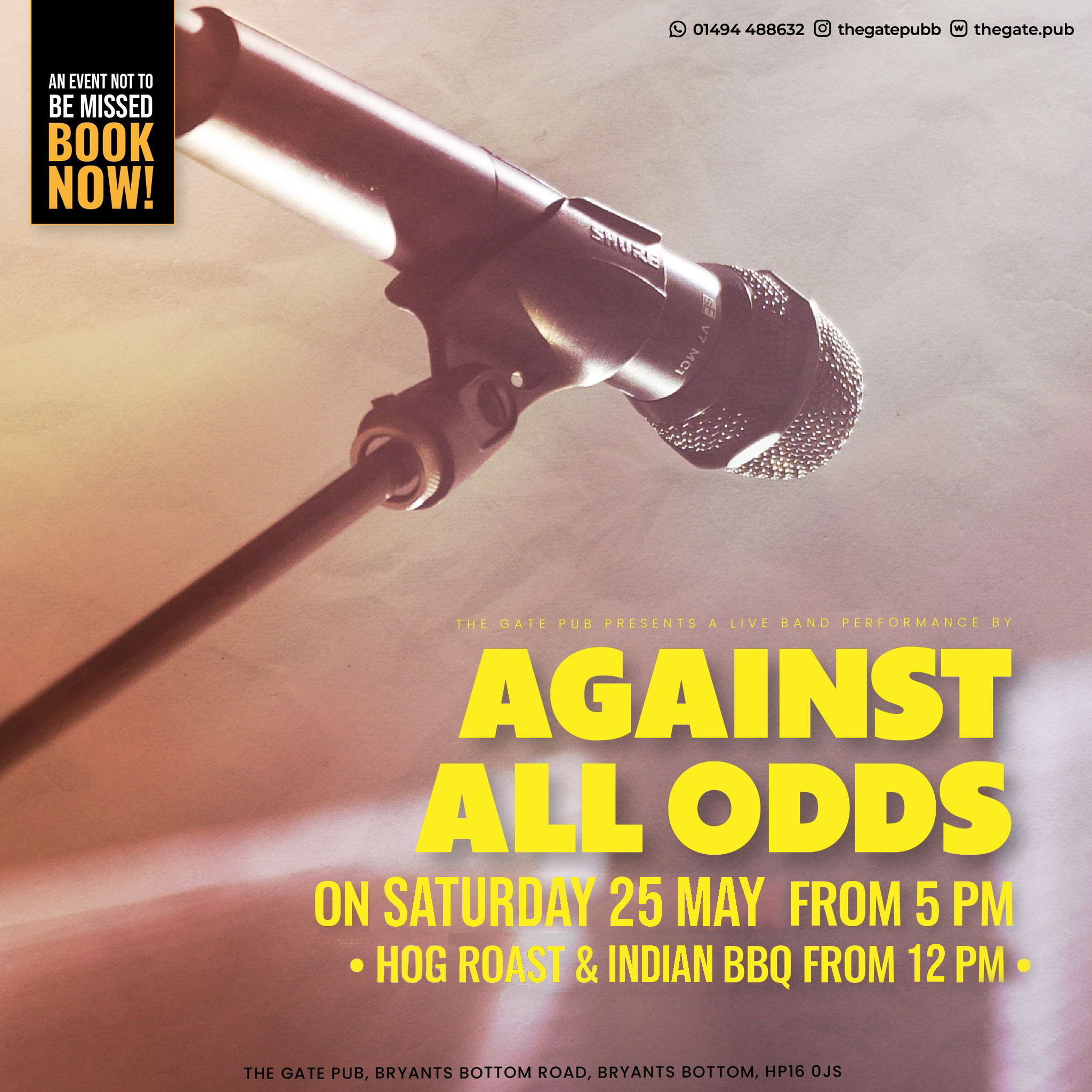 The Gate Pub & Dining The Gate Pub, Bryants Bottom Rd, Great Missenden, High Wycombe, Buckinghamshire, United KingdomJoin us at The Gate Pub on Saturday 25 May, for an unforgettable day. Staring a Live Music performance by Against All Odds, an all day Indian BBQ and a Hog Roast