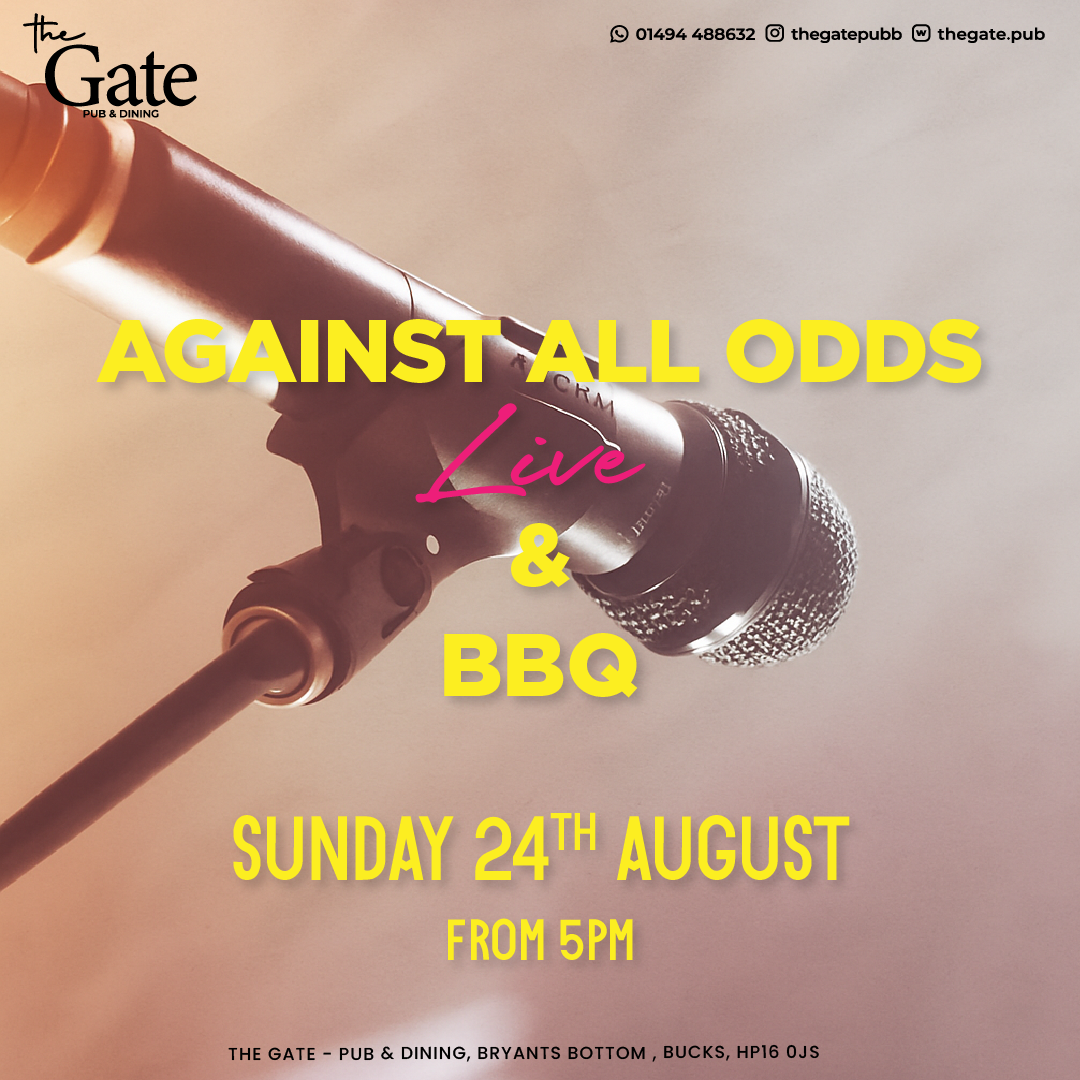 The Gate Pub & Dining The Gate Pub, Bryants Bottom Rd, Great Missenden, High Wycombe, Buckinghamshire, United KingdomGet ready for a great evening at The Gate Pub & Dining with Against All Odds performing live and a delicious BBQ to enjoy. Expect great music, tasty food, and a relaxed summer atmosphere. Bring your friends, grab a drink, and make the most of your Bank Holiday Sunday evening. Free event no tickets required …